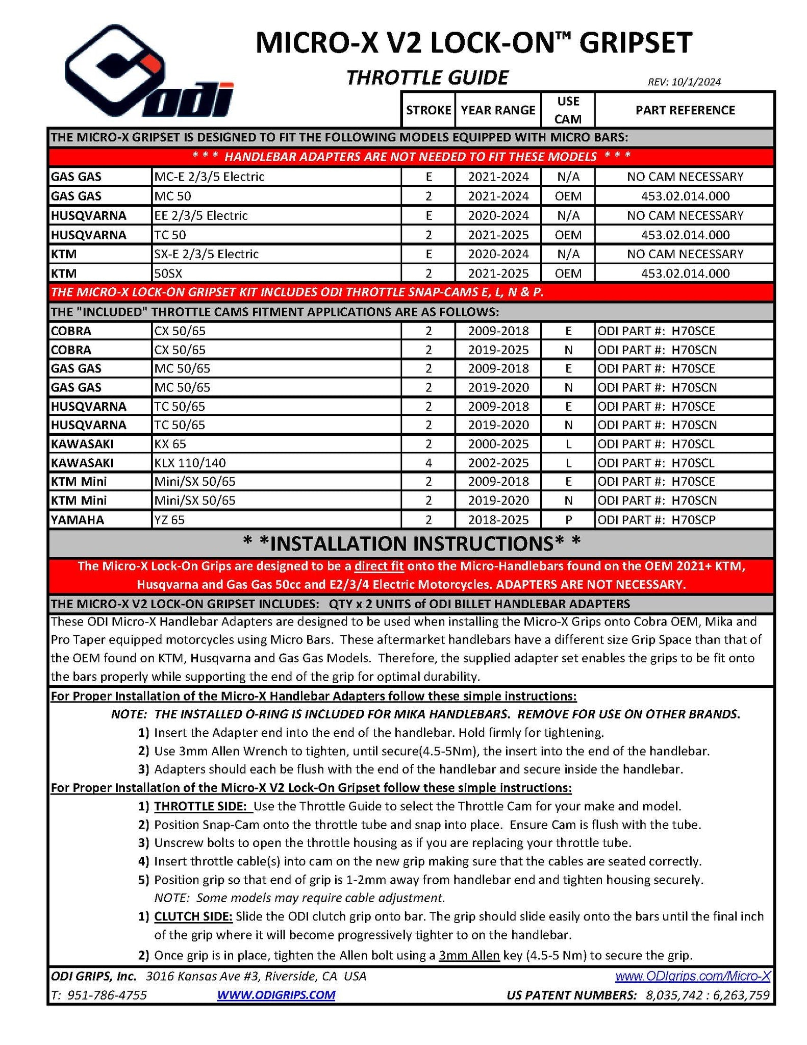 Includes Throttle Cams to fit the Following Models using "MICRO" Handlebars: