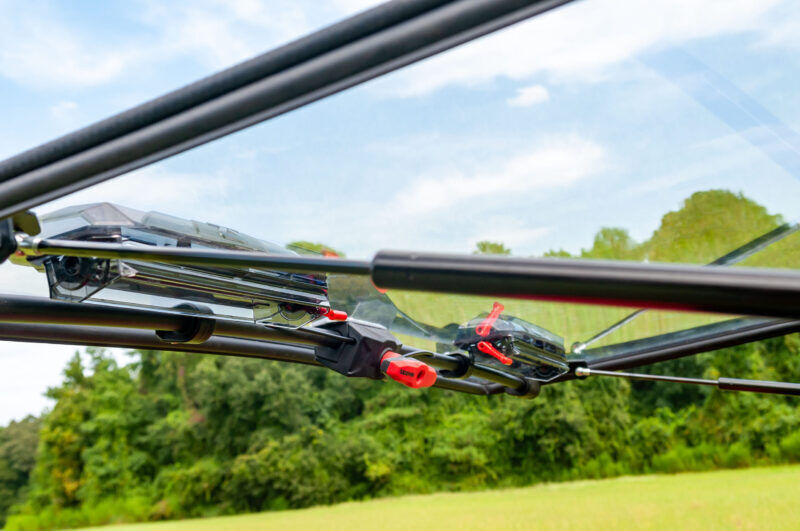 On hot days, a quick twist of the ergonomic handle opens the windshield smoothly and holds it in the fully open and up position thanks to the two gas-filled struts. Closing is as easy as pulling the windshield back down—the latching mechanisms on the lower corners engage and keep the window closed. Our low-effort, single point release system utilizes 3/4” round tubing and glass filled nylon mounts, creating a less distracting and more elegant profile along the lower edge of the windshield when compared to similar stamped steel systems.